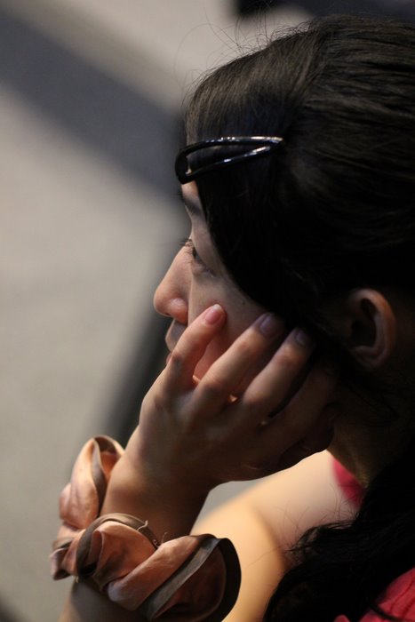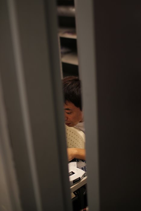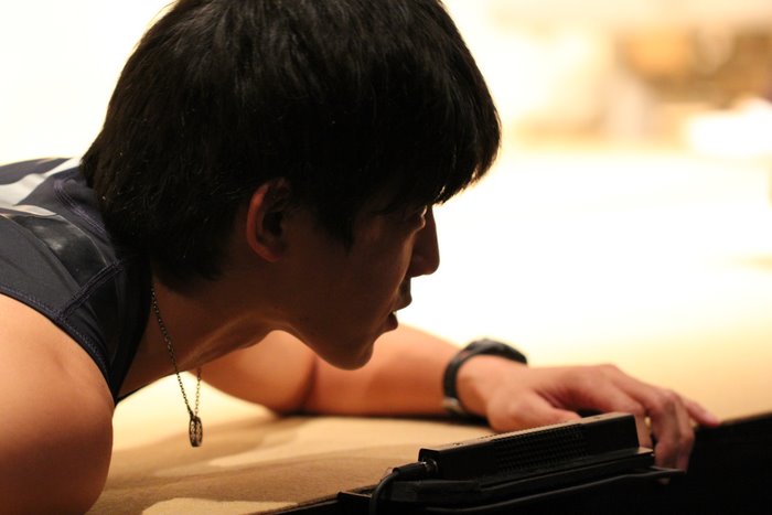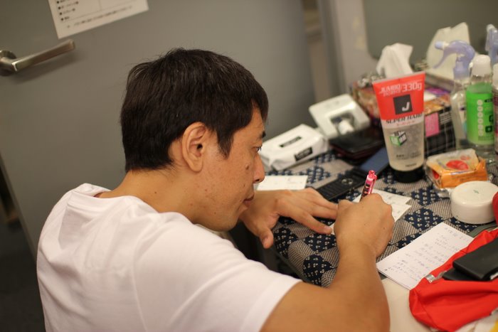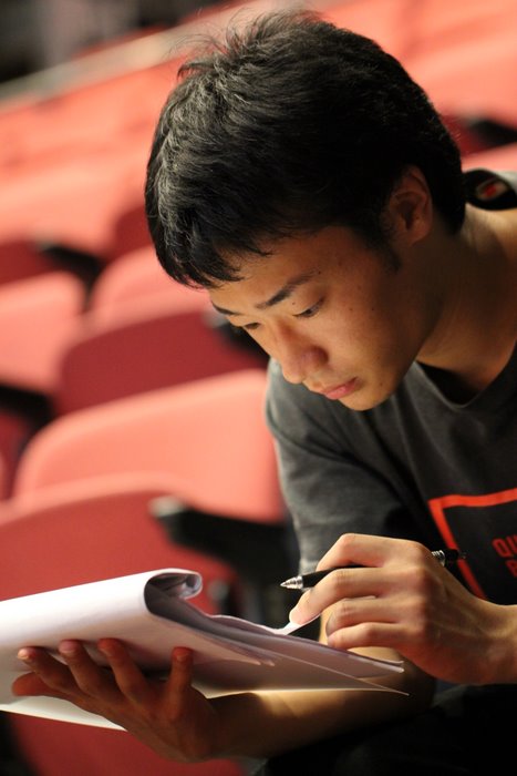 客席で台本をチェックするタツリ君。