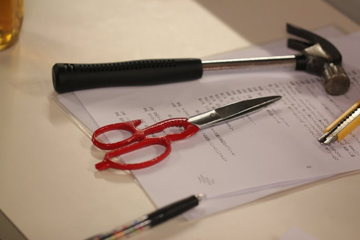 台本の上に、トンカチ、ハサミ、カッター。
