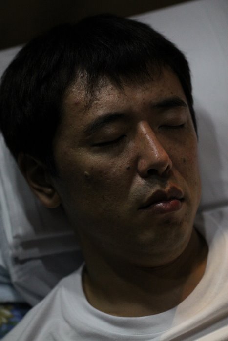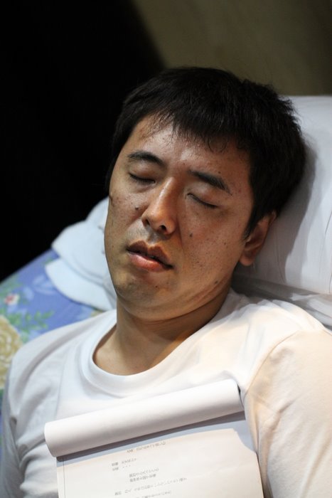 舞台裏で眠る座長・松田。