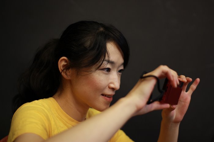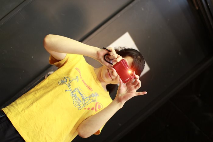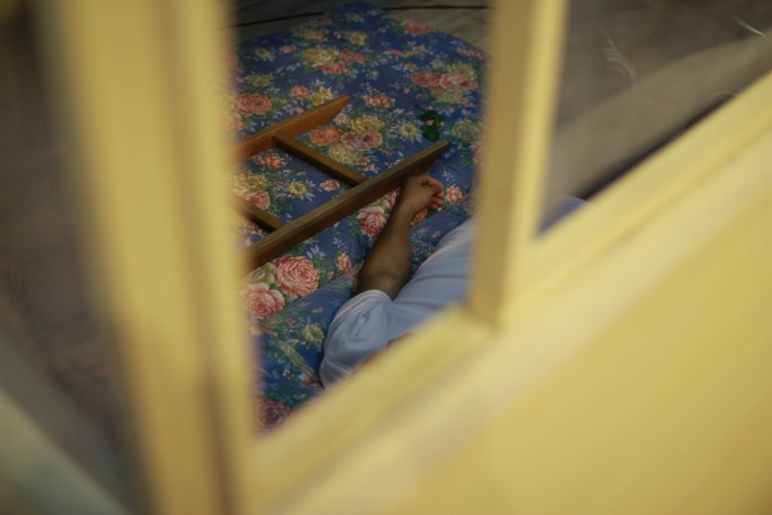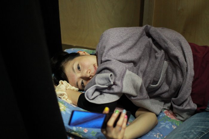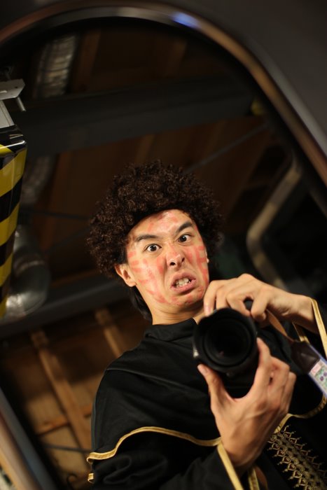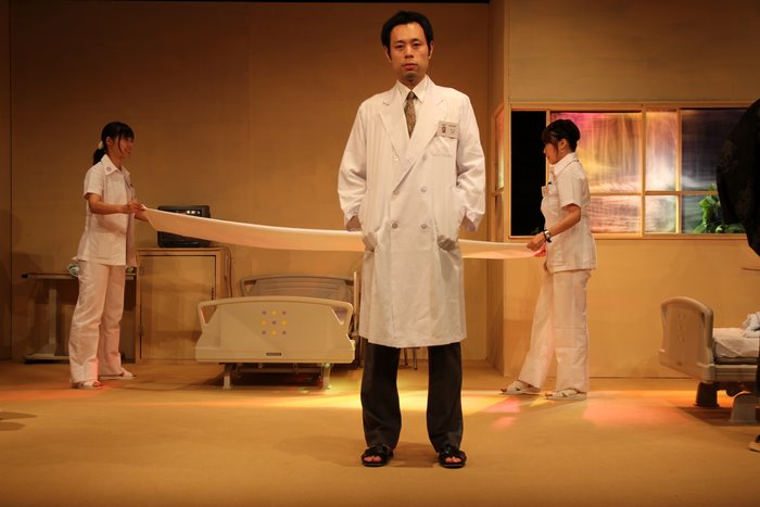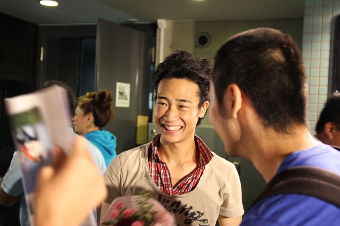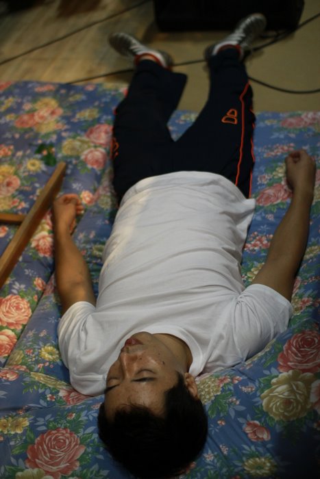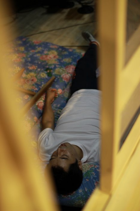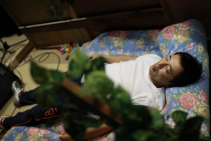 公演の合間に舞台裏の布団で寝転がる中倉。