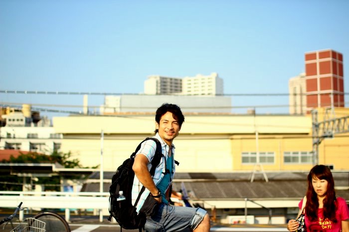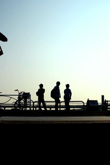 朝の光に照らされて、男三人、東武伊勢崎線「堀切」駅前。