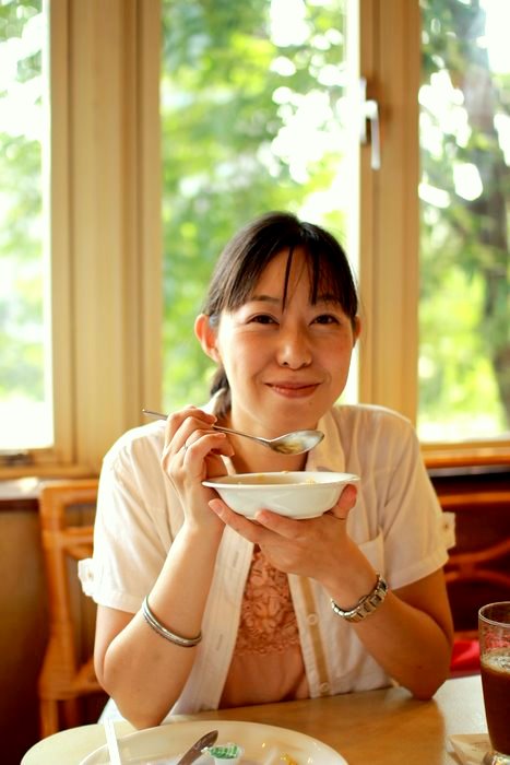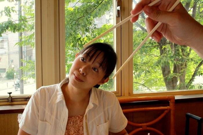 箸につままれても笑顔の手塚。彼女はどんなにつらい時でも笑顔である。