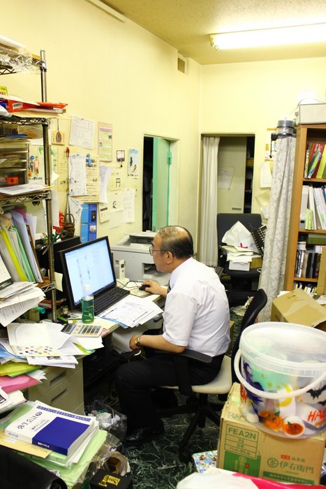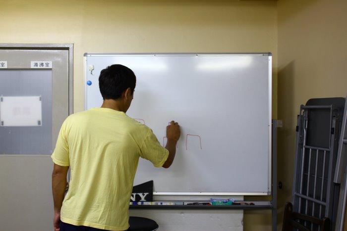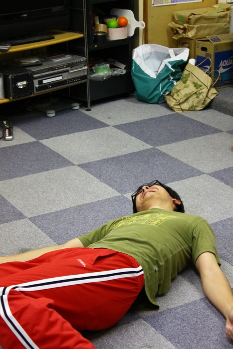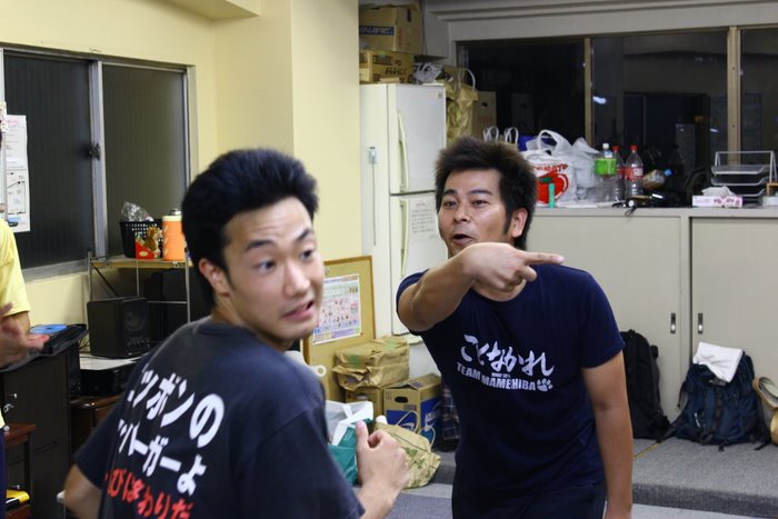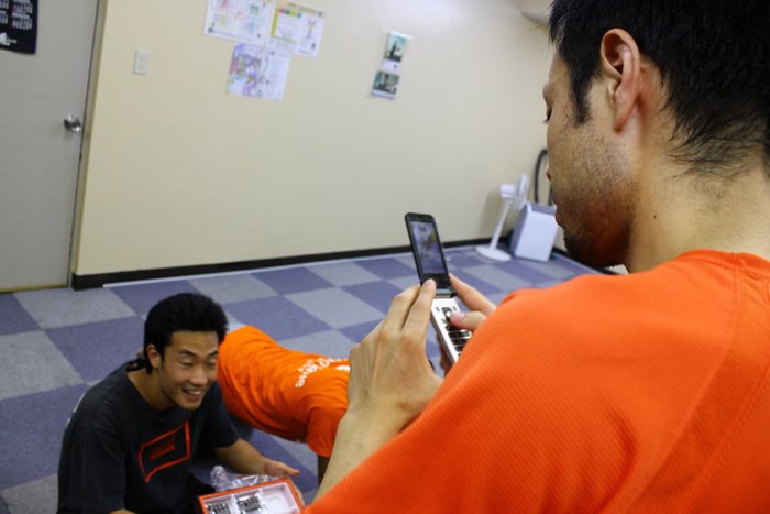 ブログアップのために、タツリ君を携帯カメラで撮影する田丸。