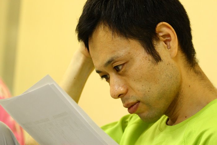 本を持ちながらの立ち稽古中です。
