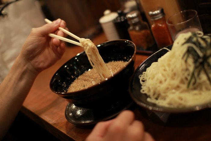 「梅もと」の名物であるつけ麺は、