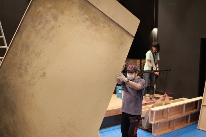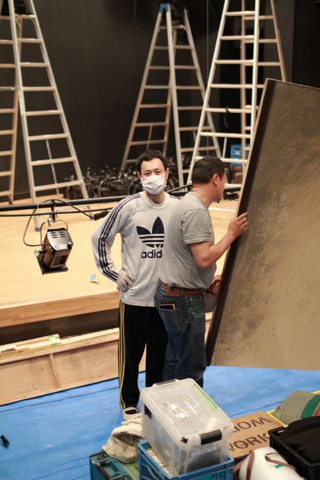 セットを組み立てるためのパネルを搬入する劇団員・元田。