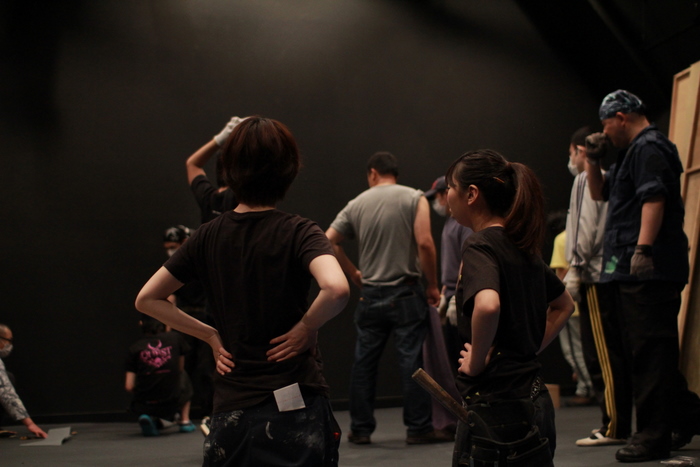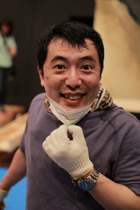 舞台裏でトンカチを持って立つ元田。