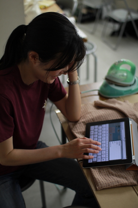 瀬戸のiPad 2で、近所の弁当屋を検索する中倉。