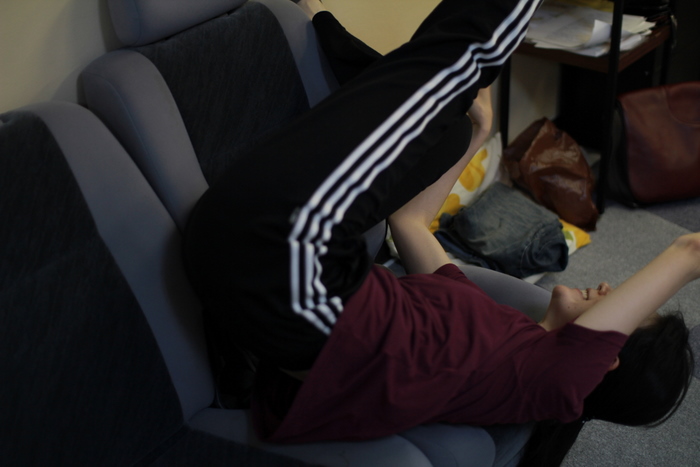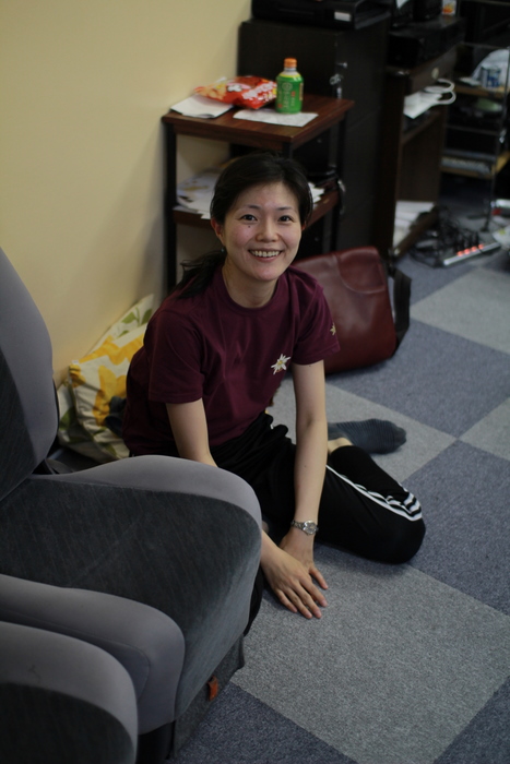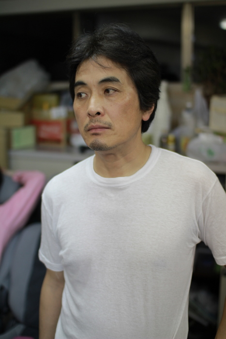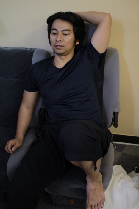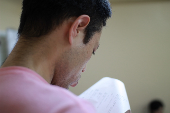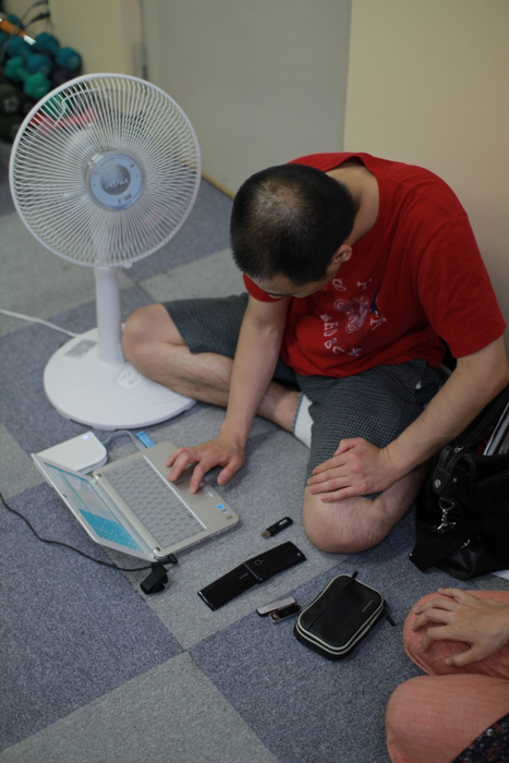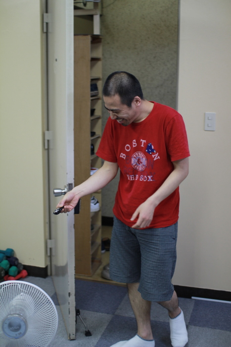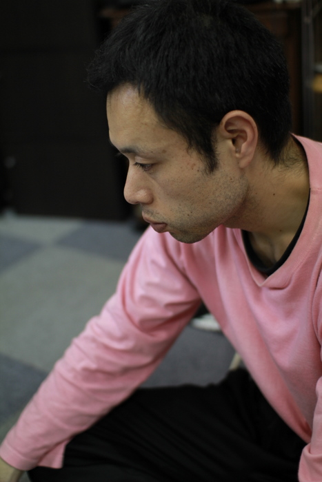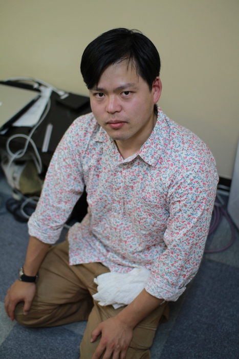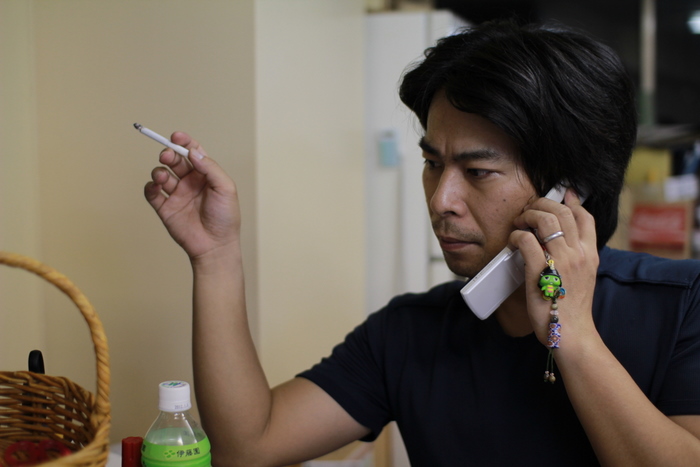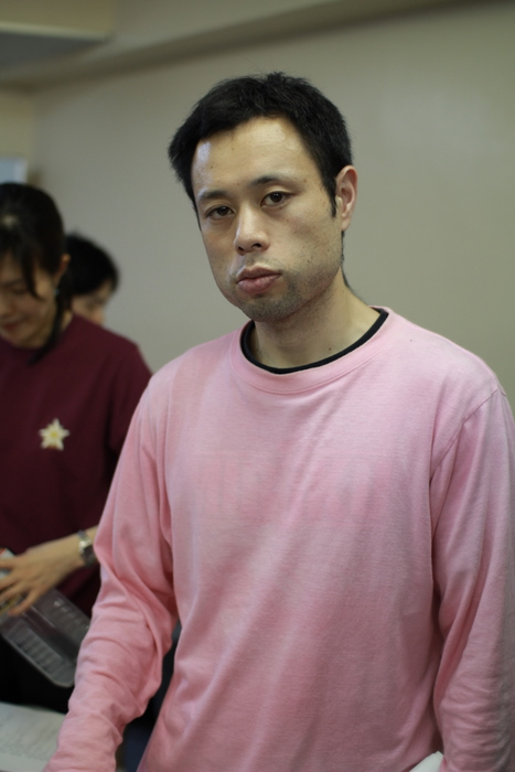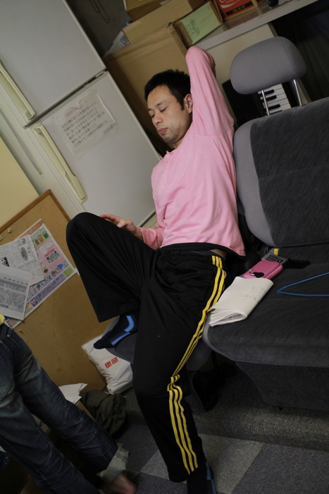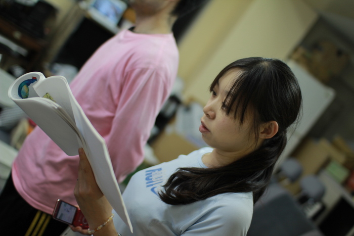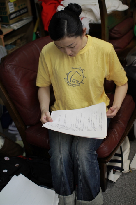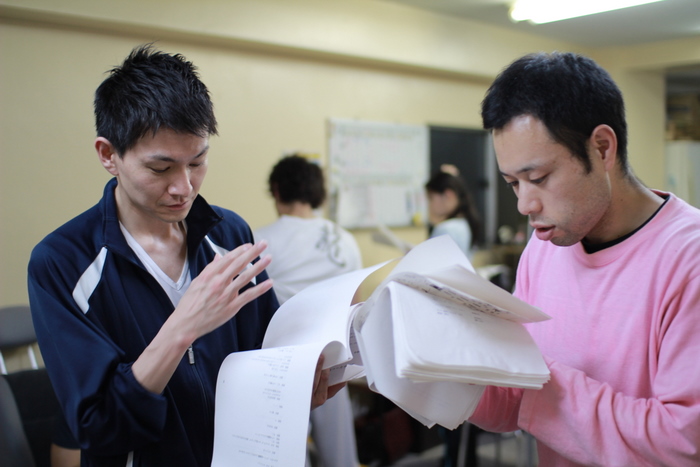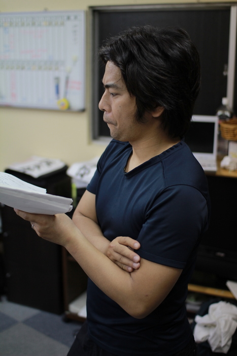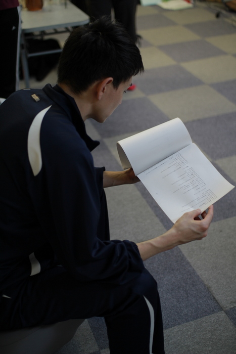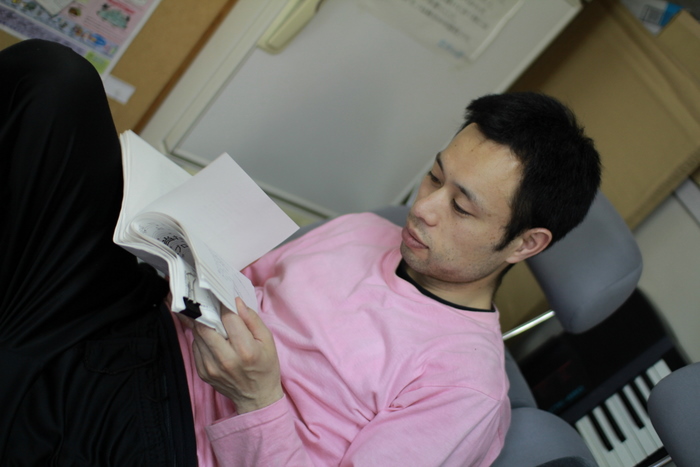 カメラに気づき、台本を読んでいるふりをする田丸。