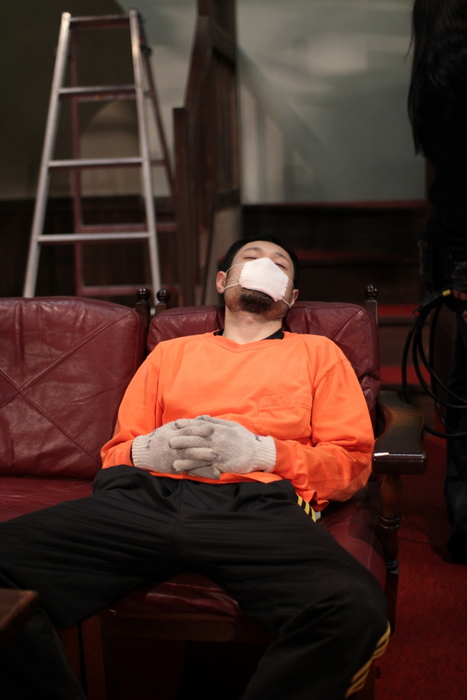 ひもで縛られている演技をしながら、