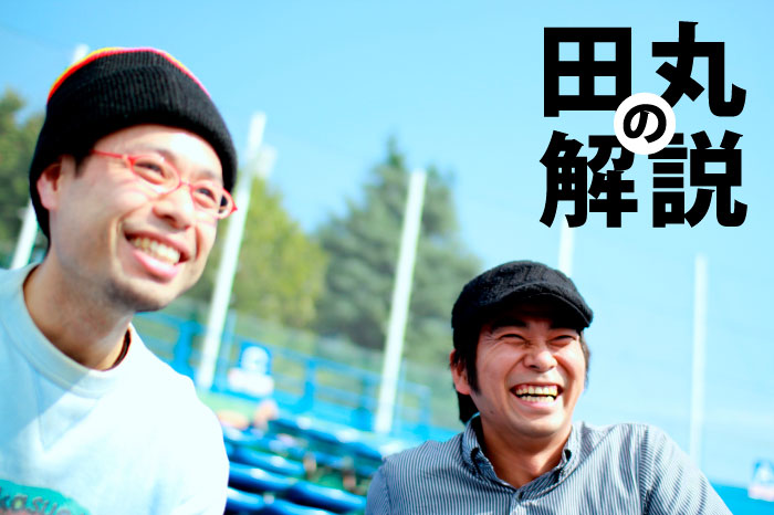 いや〜、しかしね当日の話しなんだけどね、前にネットで調べて1試合目が11時からになってたから、その時間に行ったら雨天でかなり変更があったみたいで、1試合目が13時からになってやんの。最寄りの駅についた途端、塚本からメールが来て、「田丸さん11時からじゃなくて、13時からですよ」ってきてね、「もう遅いよ、着いてるよ」って返したら、「僕も着いてます」だって。13時からって知ってたのはカメラマンの瀬戸だけ、前日にネットで見たら変更で13時になってたって言うんだよ。「それ、早く言えよ」って言ったら、「随分早いなとは思ったけど、きっと早めに集合して打ち合わせするんだなと思った」って。するわけねーだろ。ぎりぎりで行きゃいいんだからさ。でも13時まで待つことになるのかなと思ったら、11時30分くらいに入れてさ、練習風景が観られたのよ。で、早くパパって撮っちゃって、試合始まる前に帰りましょう、いいね〜って、もう3人ともやる気ないの。