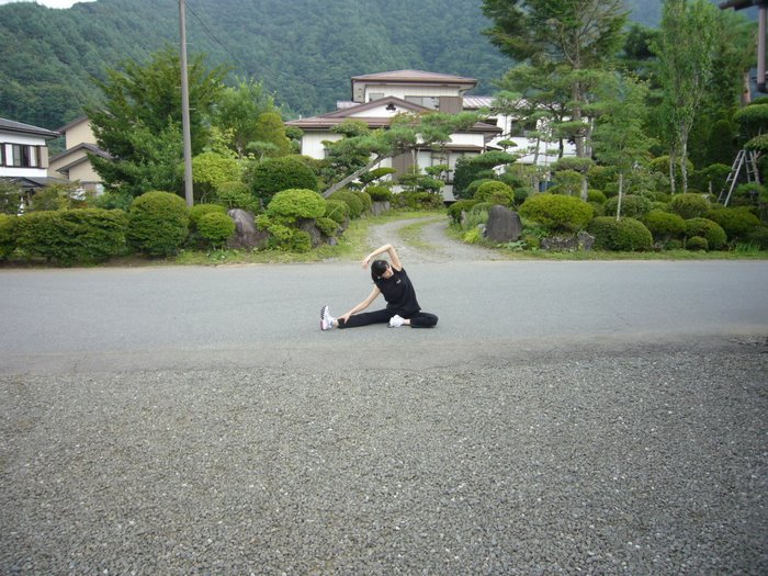 堂々と公道のど真ん中でストレッチ。